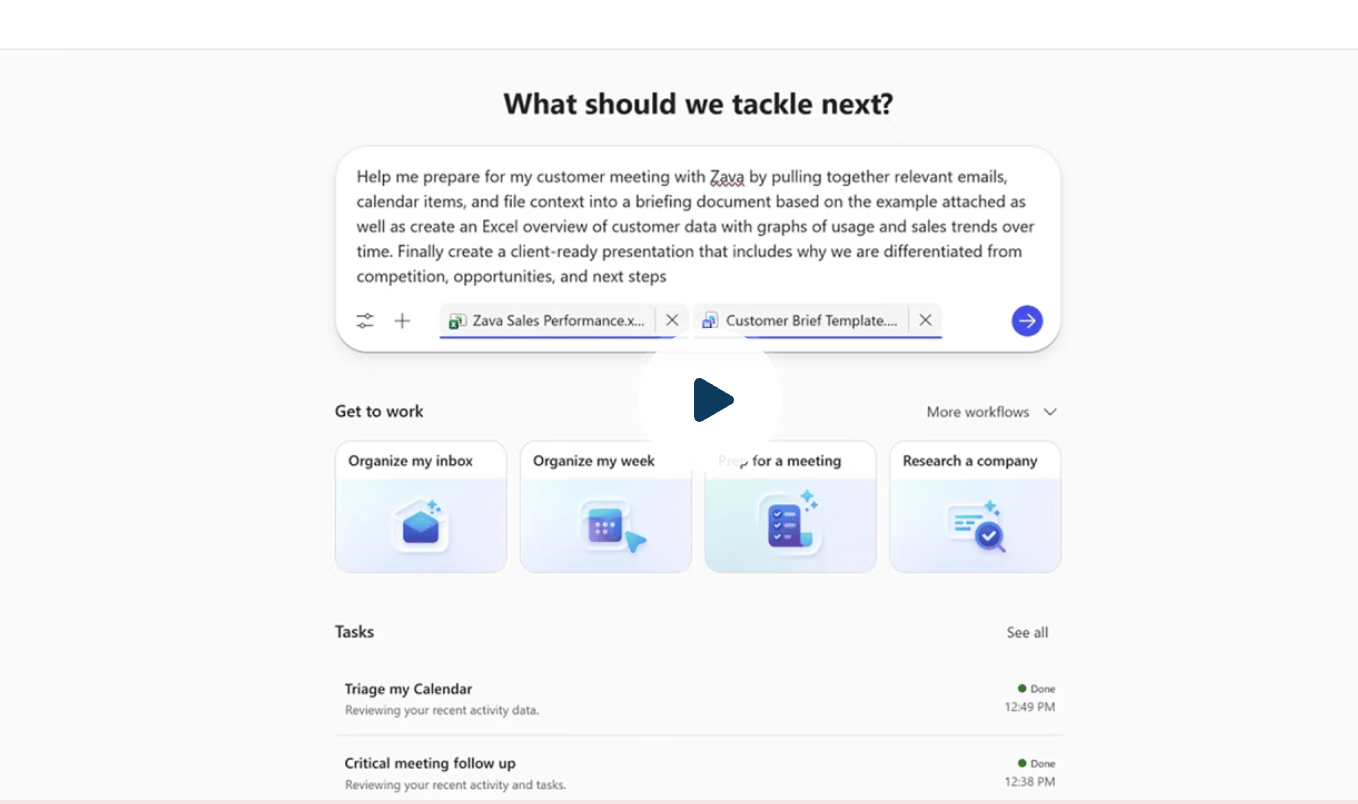 You can think of Cowork as an AI agent you can delegate tasks to. A single prompt in Copilot Cowork can assemble a customer briefing document from your CRM data, create an Excel overview with usage trends and build a client-ready presentation.