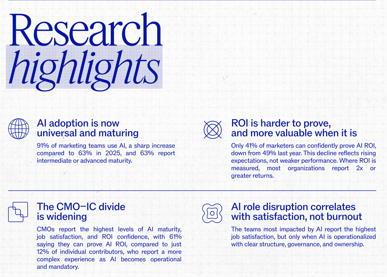Jasper's 2026 State of AI in Marketing report shows 91% of marketers now use AI, up from 63% last year, but the share who say they can prove ROI fell from 49% to 41%. More people are using AI tools; fewer can show what the investment is returning.